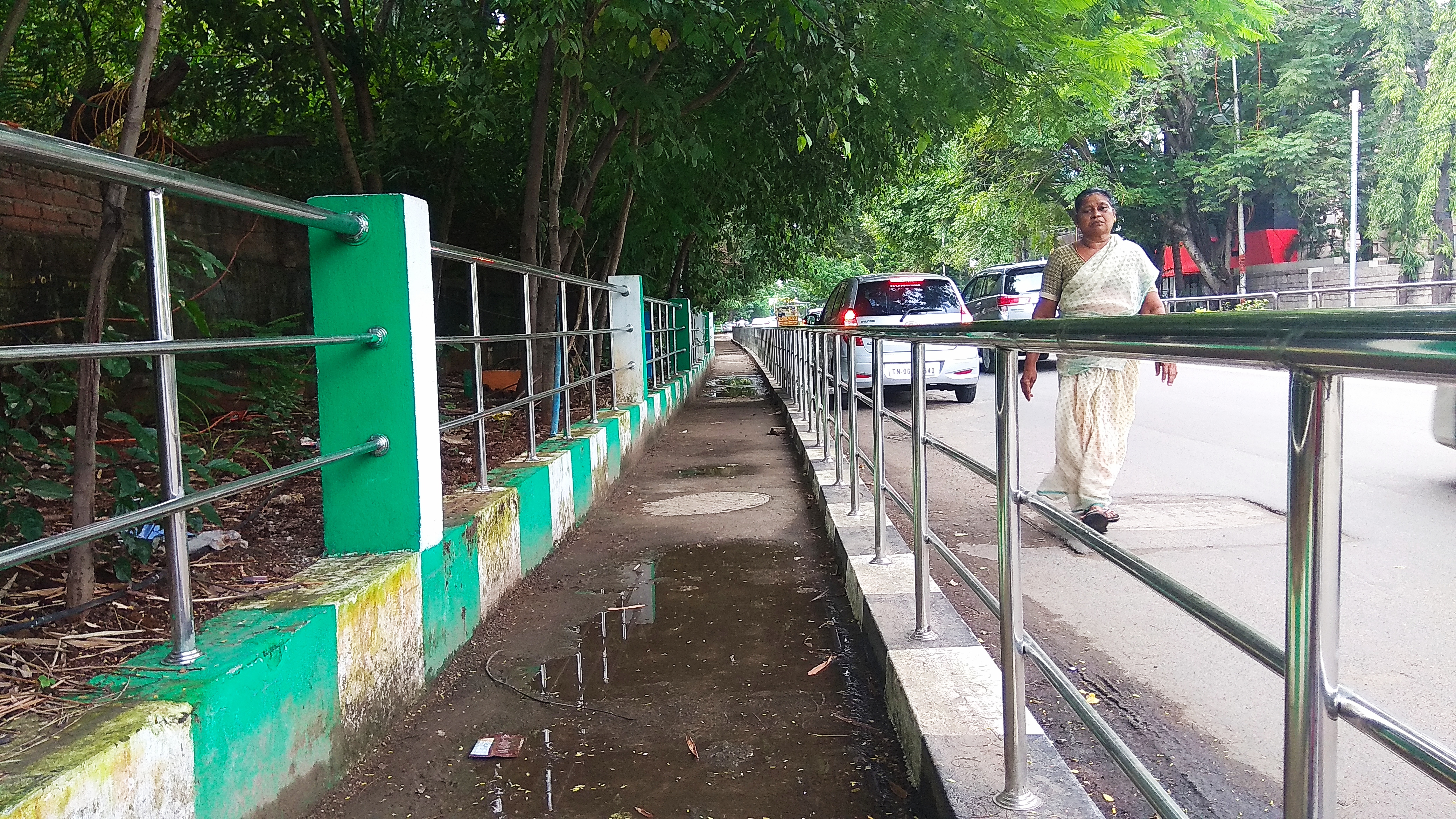 New railings have been fixed along the footpath on one side of Pasumpon Muthuramalinga Thevar Road in R. A. Puram.