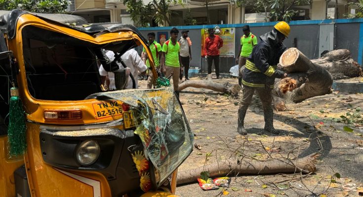 A giant branch of an old peepul tree on St. Mary’s Road in Mandaveli came crashing down on Monday, around noontime.