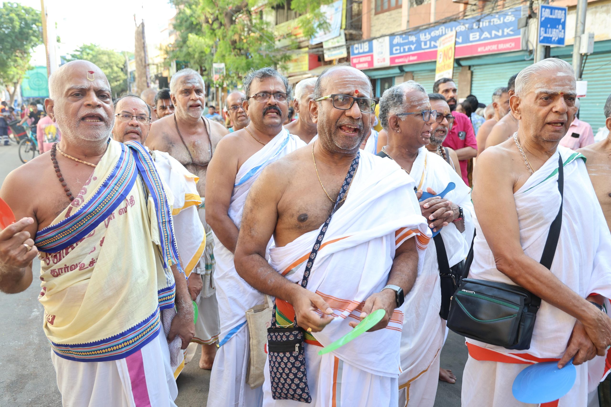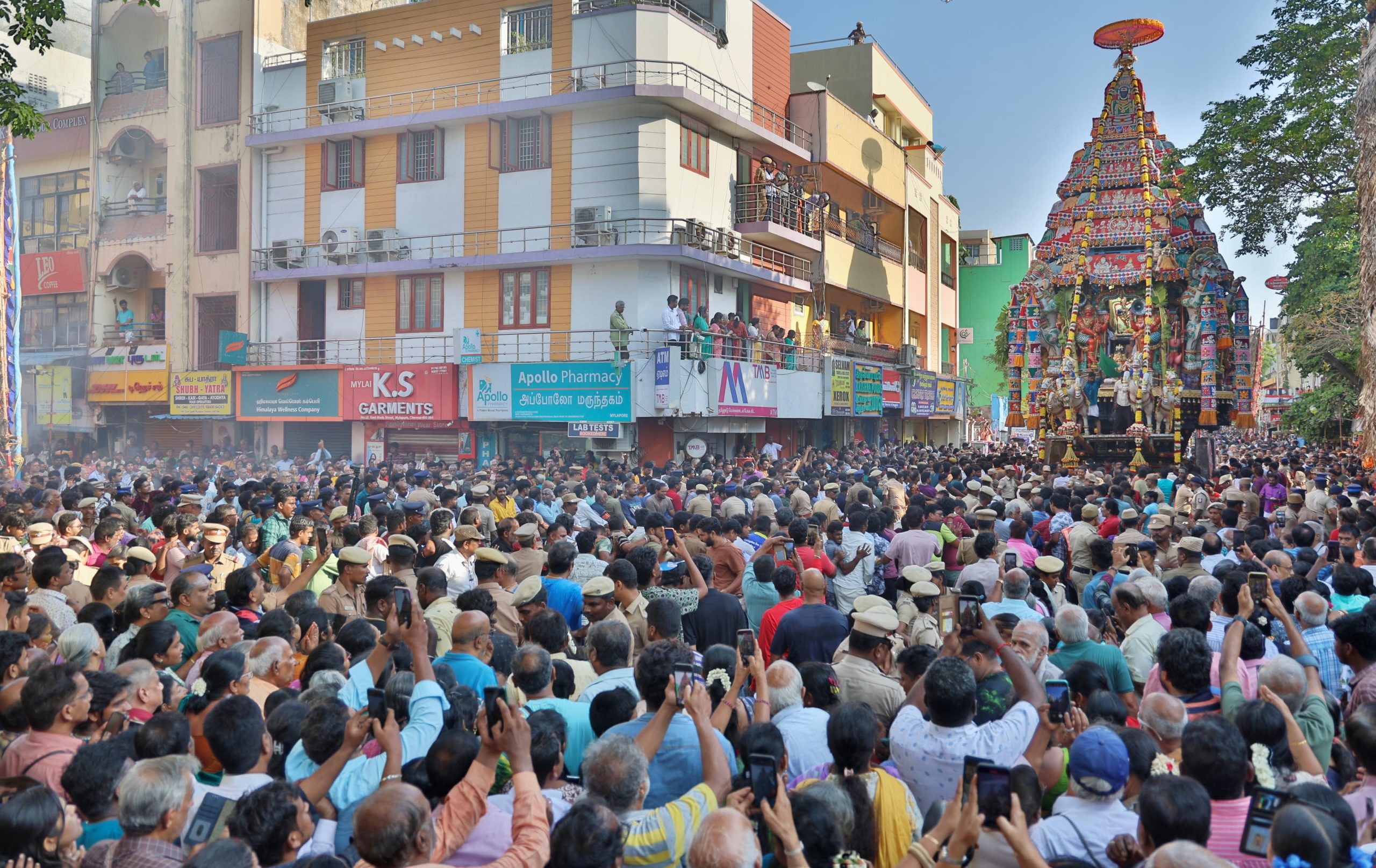 Thousands of people braved the rising heart of the April summer to find a place on East Mada Street to take part in the chariot procession of the lord as the ‘ther’ rolled out from its shed, on to the mada veedhis on April 9 morning.