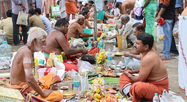 Scores of people joined priests on the banks of the tank of Sri Kapali Temple, Mylapore to take part in rituals on the occasion of aadi amavasya, a day when Hindus remember the departed.