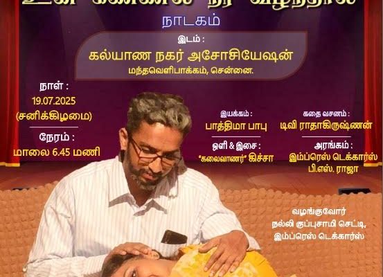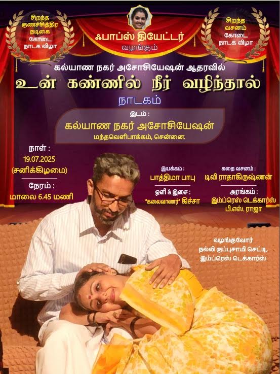 Arts / EventsTamil drama to be staged in Mandavelipakkam. July 19 Thursday, July 17, 2025Thursday, July 10, 2025 Facebook Twitter WhatsApp LinkedIn Email Print The popular Tamil drama, உன் கண்ணில் நீர் வழிந்தால் is to be staged at The Kalyana Nagar Association hall in Mandavelipakkam on July 19 at 6.45 p.m. All are welcome to watch the play. Tags: kalyana nagar association
