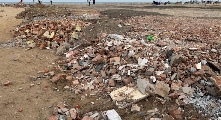 Lorryloads of debris and construction waste have been dumped from the San Thome High Road end to the seafront end to enable trucks carrying images of lord Vinayaka here to be immersed in the sea,