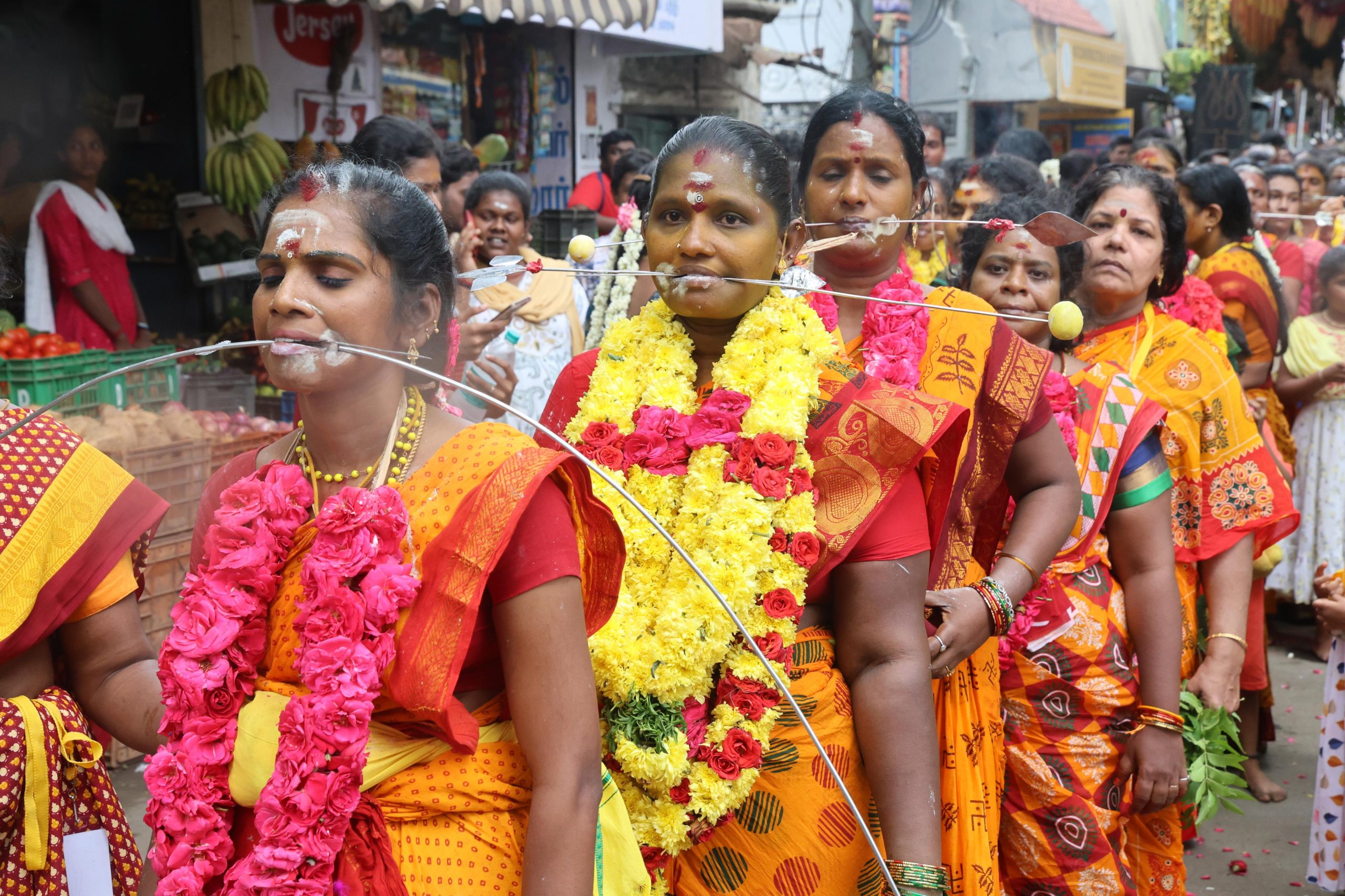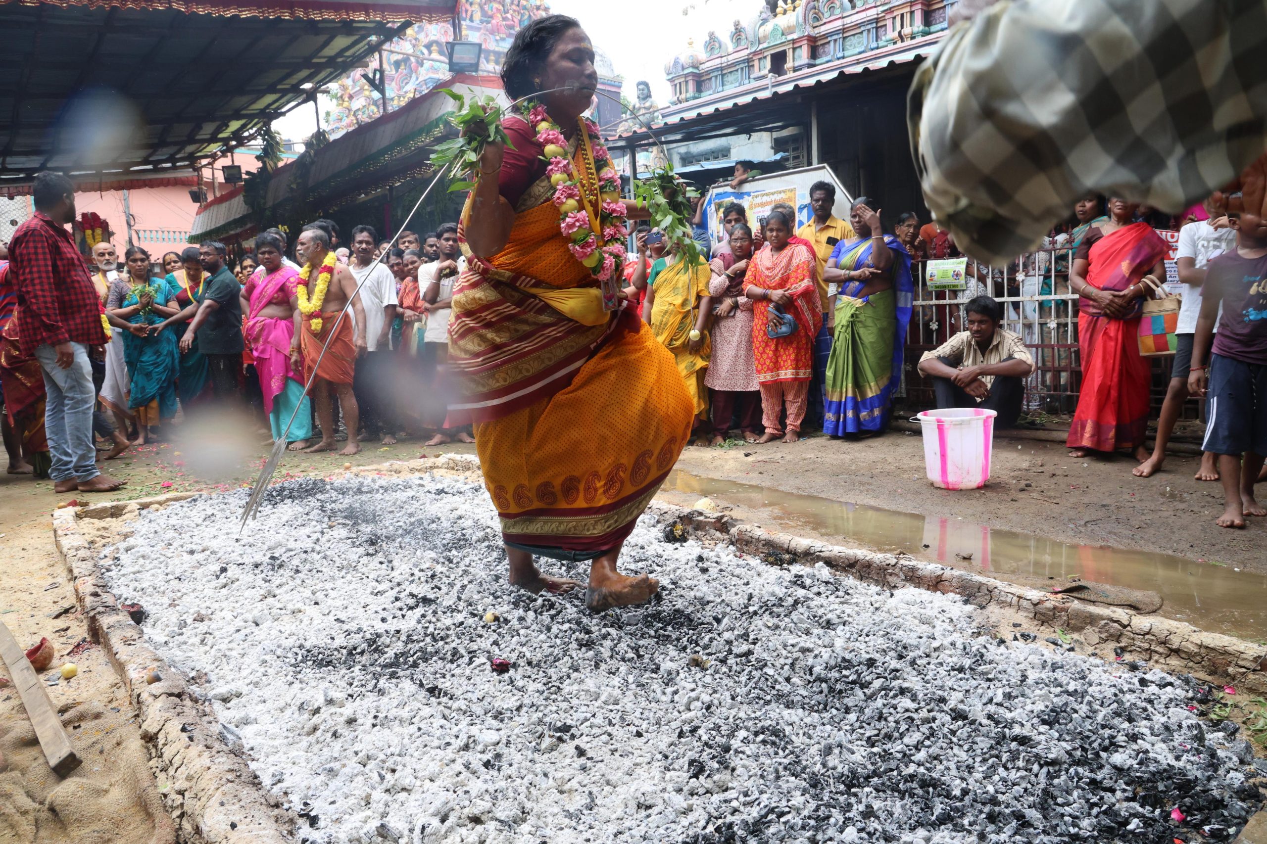 A bed of burning coals was prepared and all those who wished to walk across this bed, some 15 ft long, were asked to form a queue and took turns to walk on it – saying they did this to fulfil vows.