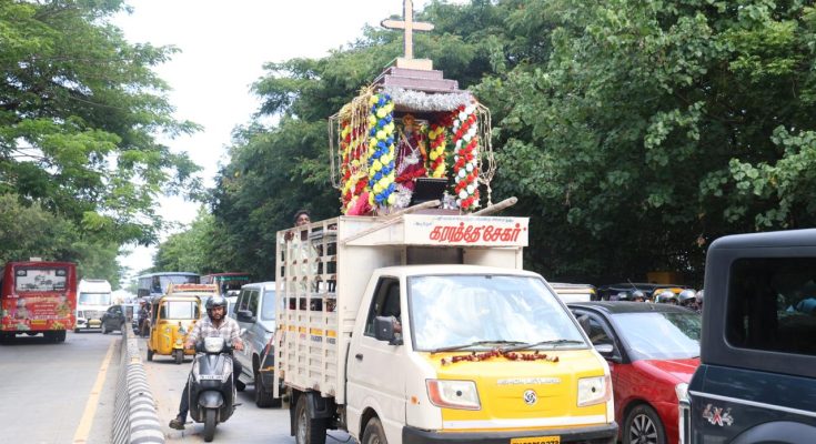 Huge streams of pilgrims headed to the Annai Vailakanni Shrice church in Besant Nagar were seen walking down San Thome High Road, Dr D G S Dinakaran Road and across the Thiru Vi Ka Bridge into Adyar to attend the flag hoisting event that signals the annual feast of the Madha.