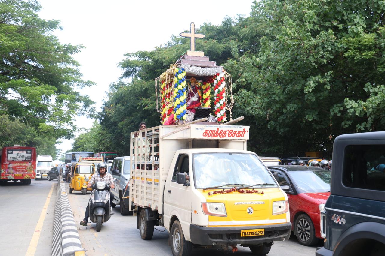The stream of devotees grew thick and fast after 2 p,m. Some carried flags of Annai Vailankanni, some pulled a cart that held the image of the Madha, some said prayers and some were in a jolly mood. Women with babies in arms and seniors were also seen walking, as they must have all made a vow to trudge to the shrine today.