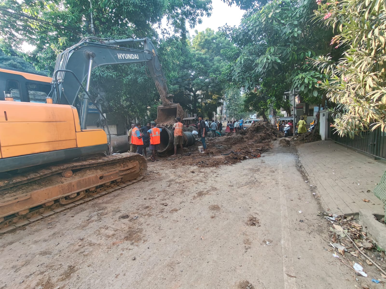 Major sewage pipeline relaying work is in progress at the Thiruvengadam Street intersection outside Ragamalika Apartment.