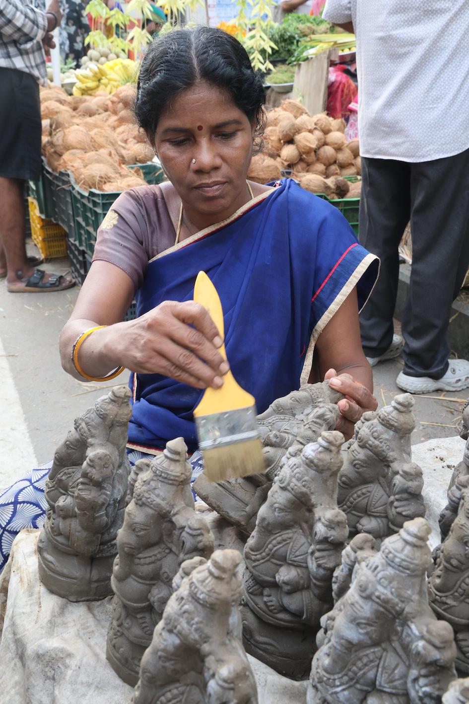 Images of Vinayaka, clay ones, sold at Rs.100 – 125. The fancy, tall ones sold at Rs.3,000. Some are brightly painted and these are from Mumbai and Kolkatta, said one hawker.