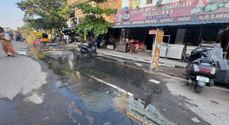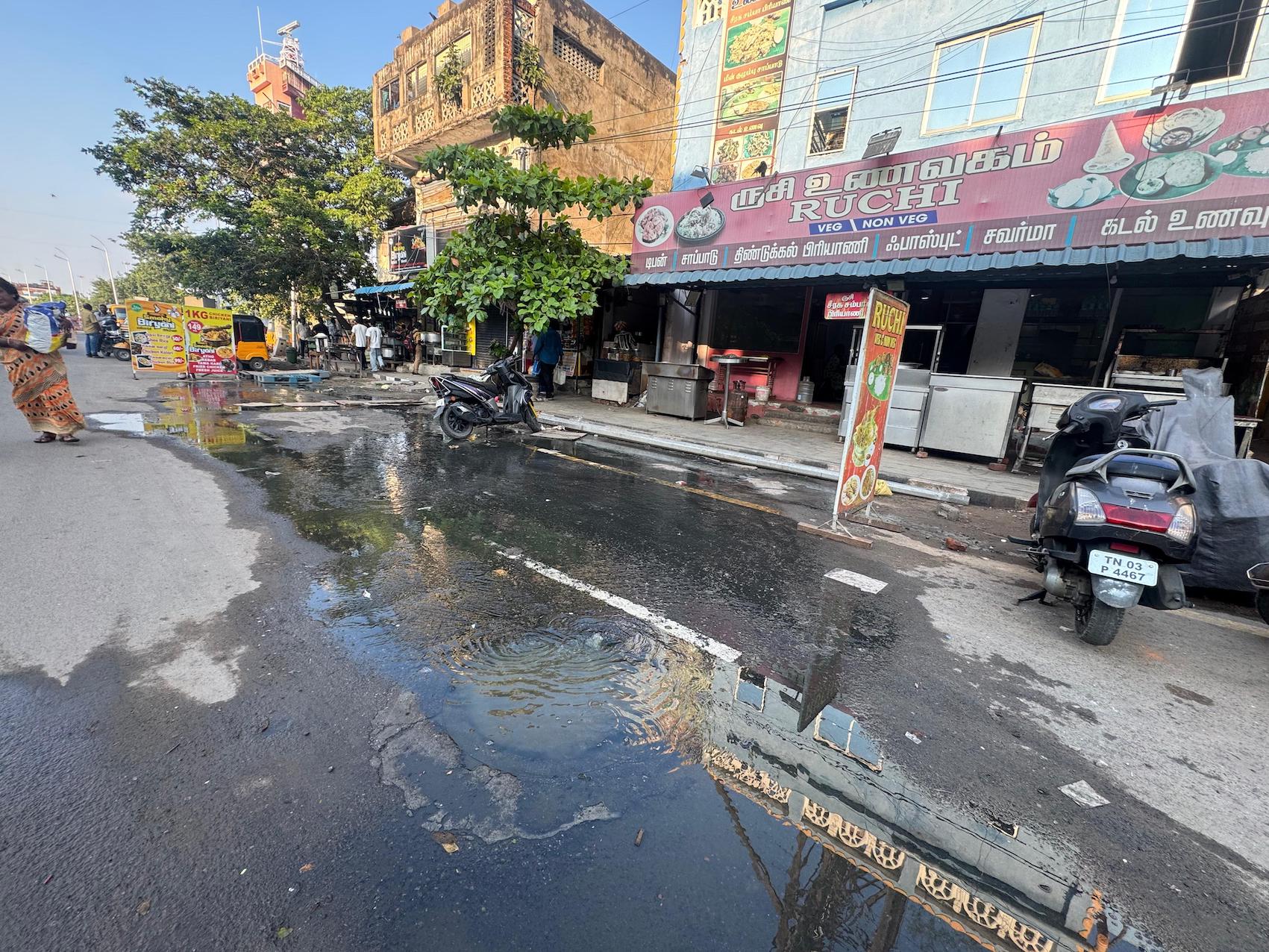 The zone diagonally opposite All India Radio on Kamaraj Salai was smelling badly all evening as sewage flowed out of the main drain in the middle of this busy road.