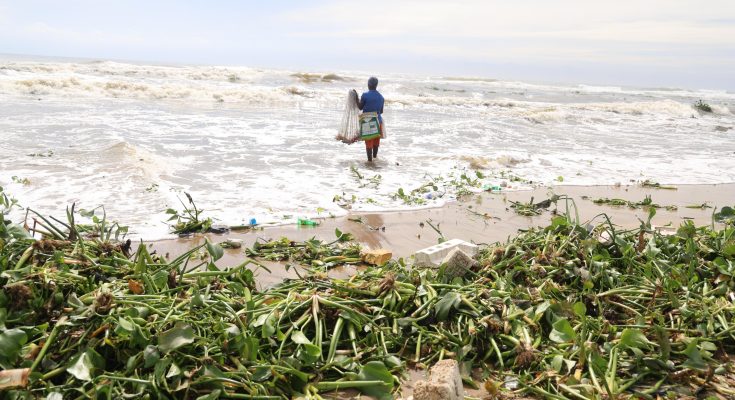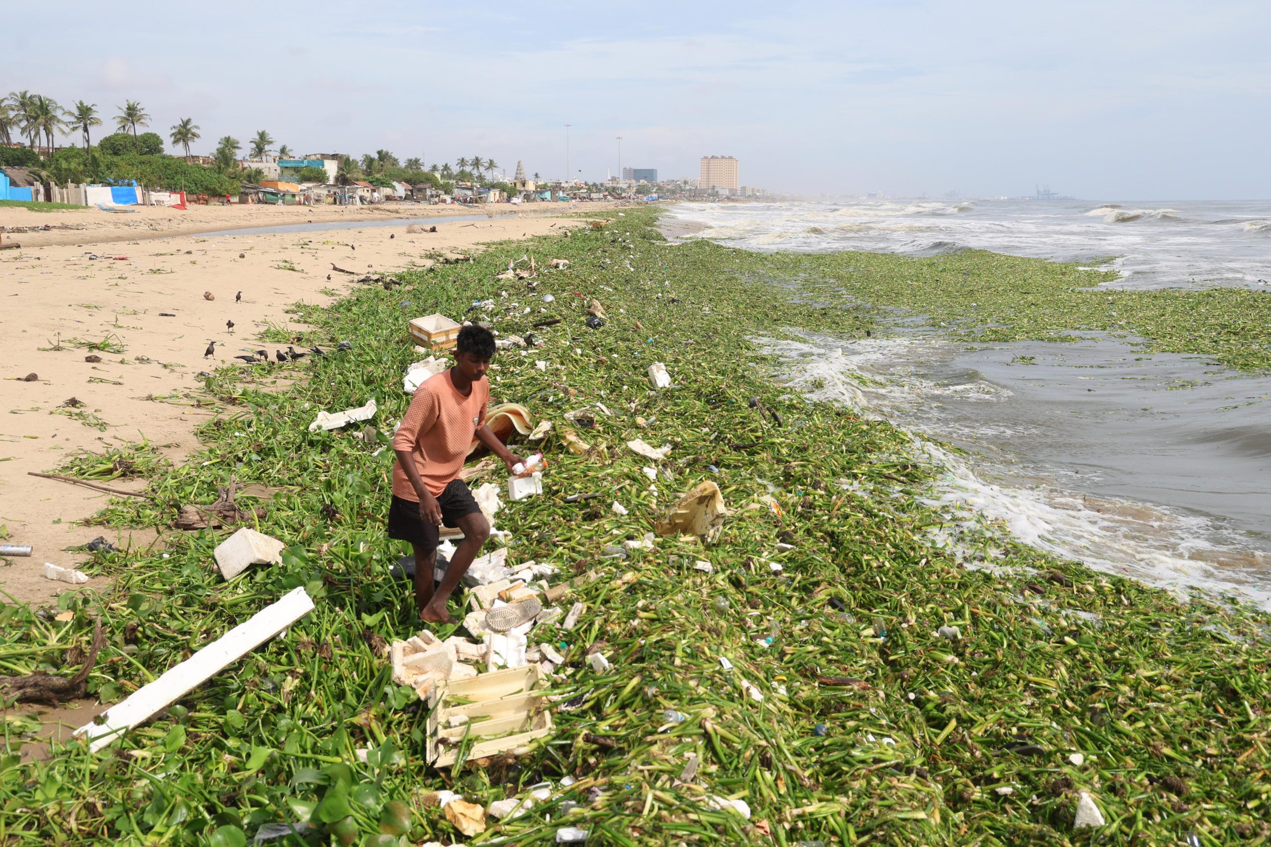 Lots and lots of marine vegetation and other waste is being washed up on the shore of the Marina beachside in Srinivasapuram, which lies at the mouth of Adyar river.