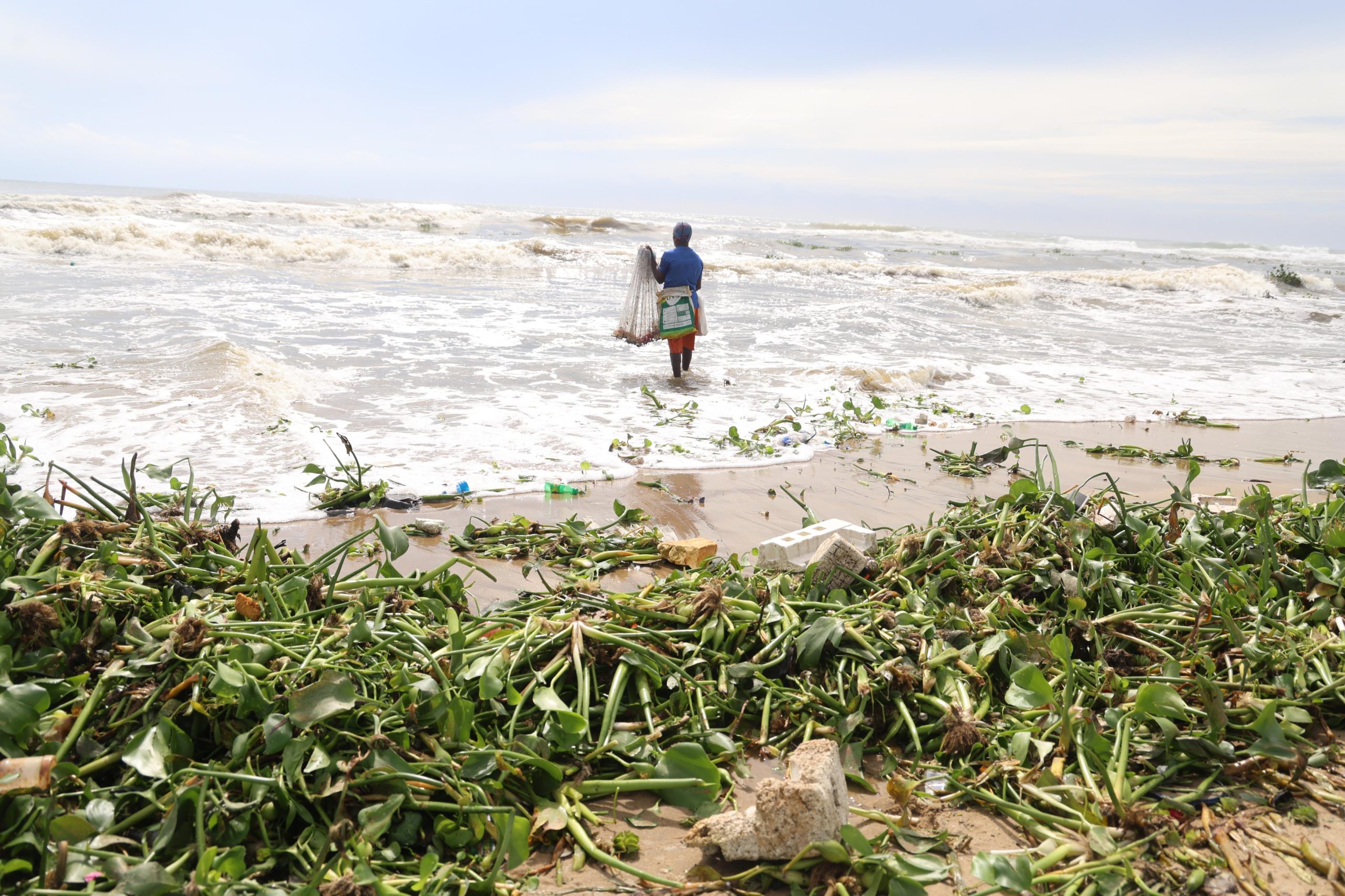 Lots and lots of marine vegetation and other waste is being washed up on the shore of the Marina beachside in Srinivasapuram, which lies at the mouth of Adyar river.