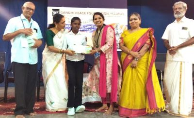 To commemorate the 156th birth anniversary of Mahatma Gandhi, Alwarpet based Gandhi Peace Foundation conducted an oratorical contest on Oct.2 at St. Raphael’s Girls Hr.Sec.School,. San Thome 116 students from … Continue reading On Gandhi and his values. Theme for oratorical contest. 30 schools and colleges took part