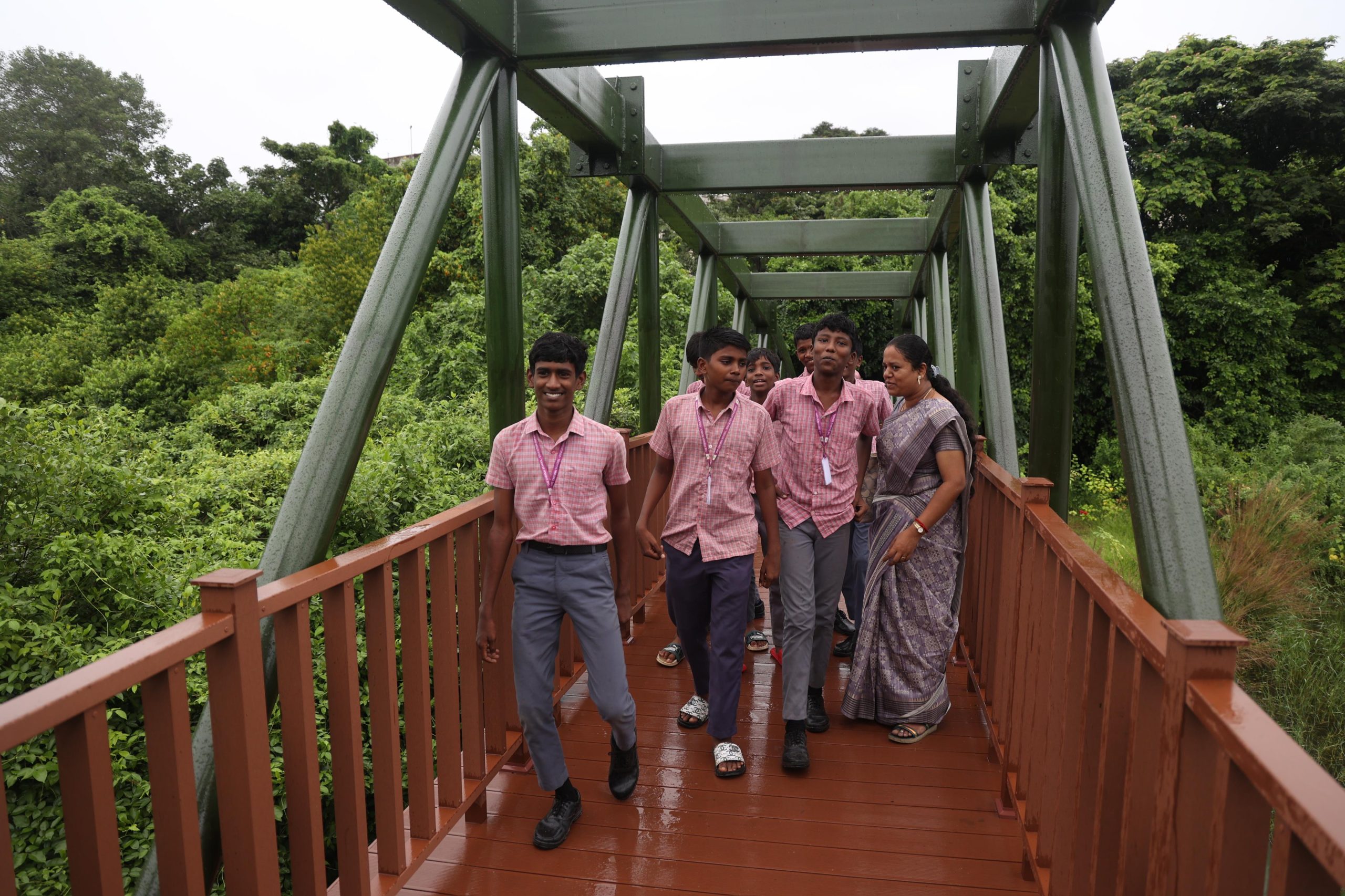 A long, elevated walkway which runs above the busy D G S Dinakaran Road at the South Canal Road junction, allows visitors to move from the west section to the eastern section where another part of the estuarine waters exist, though much of it is still very polluted.