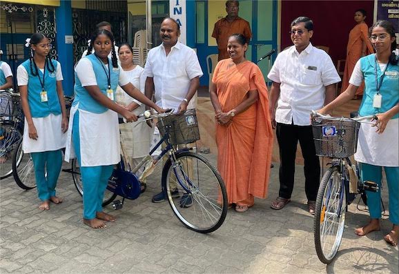 Mylapore MLA Dha Velu distributed a set of bicycles to students of St. Anthony’s Girls School, Madha Church Road, R A Puram as part of a state-managed scheme which provides free cycles to senior students.