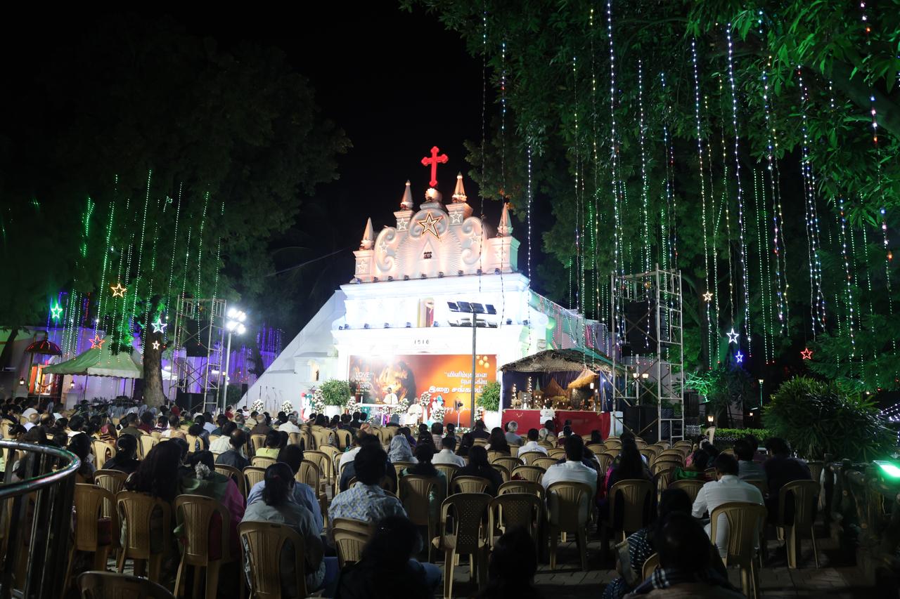 On Lazarus Church Road, at Our Lady of Guidance Church, the church choir sang carols in Tamil in the open air where the Mass was held that night. Holy Mass in Tamil followed and the whole campus was packed with parishioners and their guests. ( photo below)