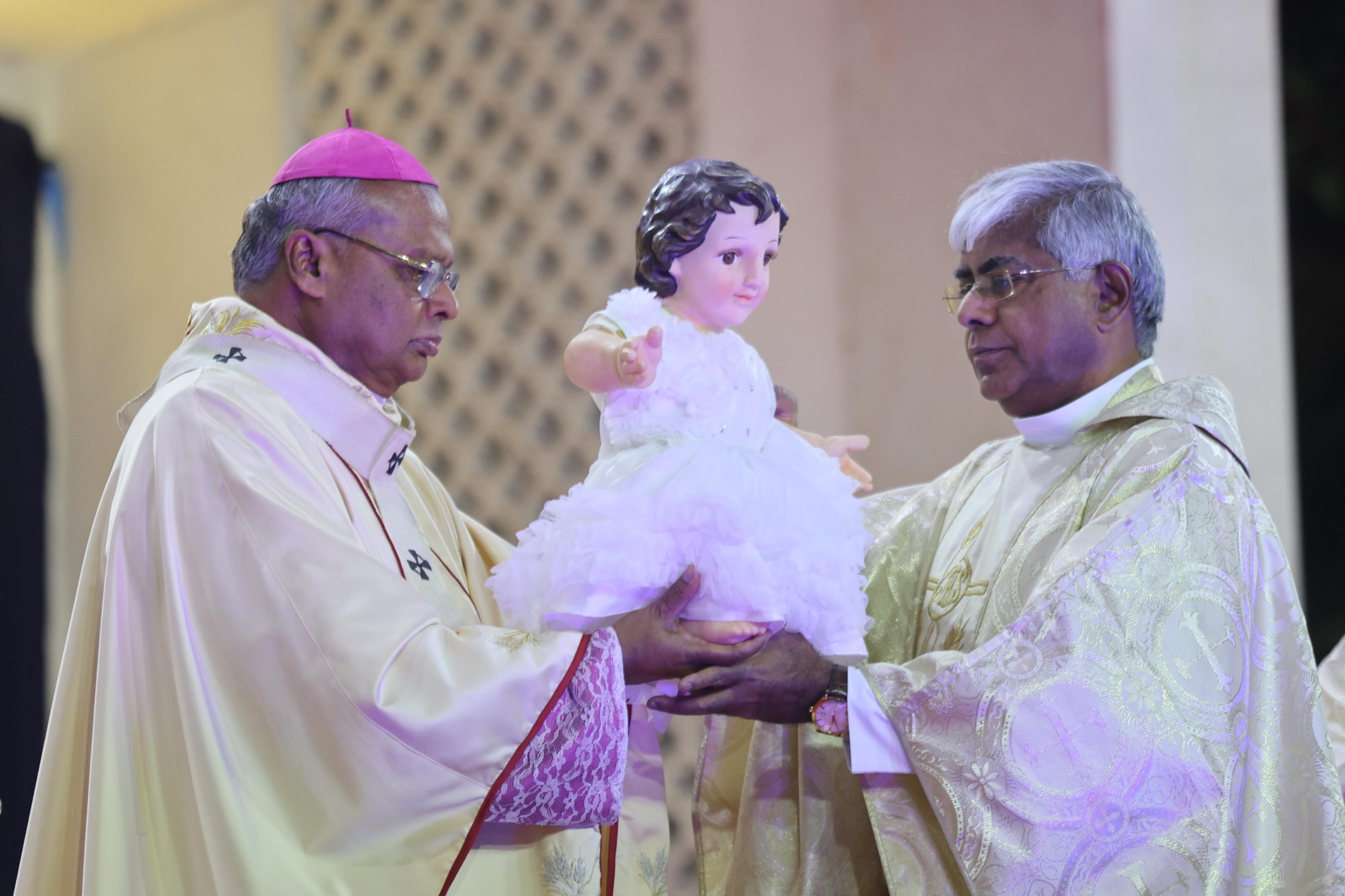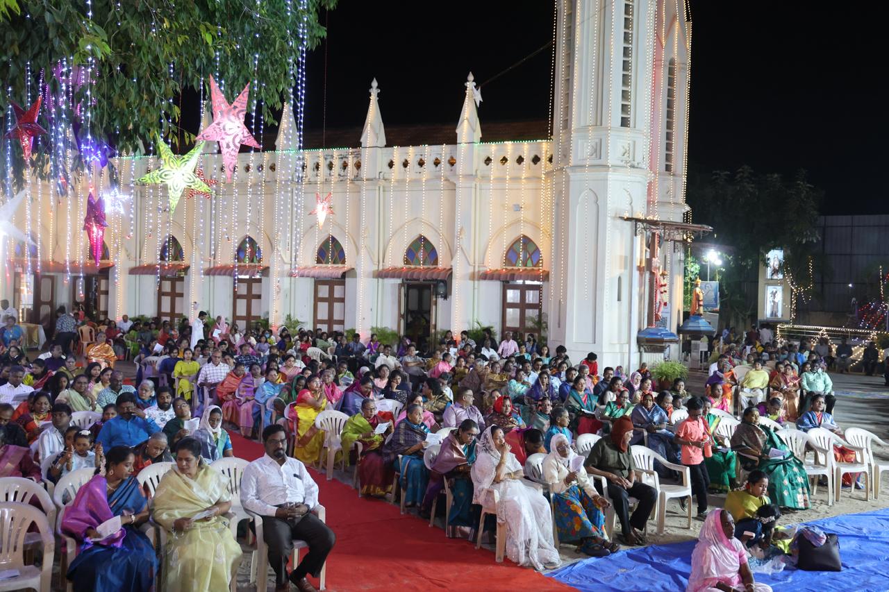Much later, archbishop Rev. George Antonysamy led the celebration of the Christmas Mass in Tamil the open air in the San Thome Cathedral campus, as the clock closed in on the midnight hour. ( first photo featured in this report)
