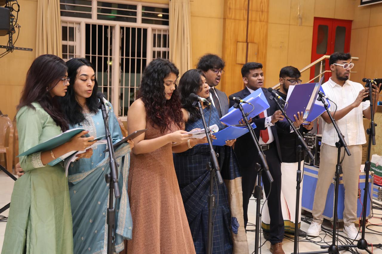 Holy Mass in English was celebrated at about 10.30 p.m. in the auditorium of St. Bede’s School after a session of carols. ( photo above is of the choir at St. Bede’s hall at Mass)