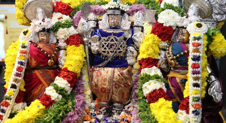 At the end of the deep-aradhanai, the procession of the gods began and the palaquins were rested in the 16-pillated mantap in Sannidhi Street in the eastern precinct of the temple zone.