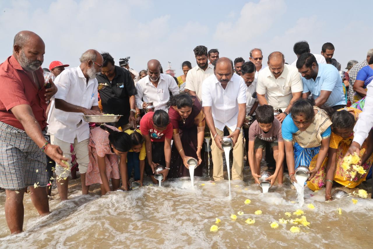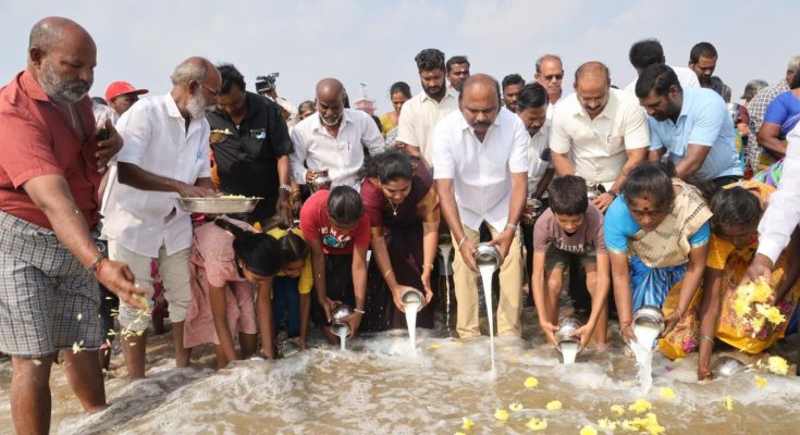 This morning, a few members of fisherfolk in the Nochchikuppam zone off the Loop Road, joined Mylapore MLA and DMK cadres and the local area councillor Revathy, to carry milk in pots and empty the milk into the sea at the shore, as a symbolic prayer and offering that people be protected from calamities.