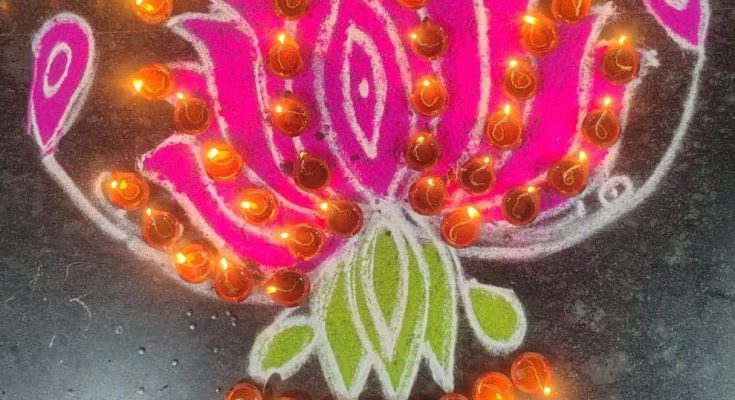 The kolams and Rangolis and the lamp decorations were done by devotees and volunteers. All the earthen lamps were lit by people visiting the temple.