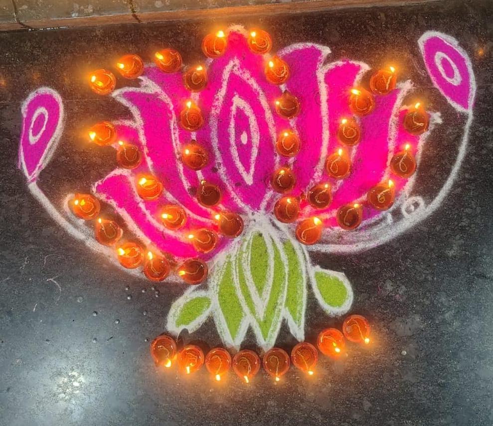 The kolams and Rangolis and the lamp decorations were done by devotees and volunteers. All the earthen lamps were lit by people visiting the temple.