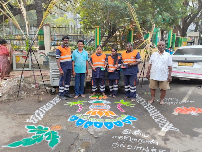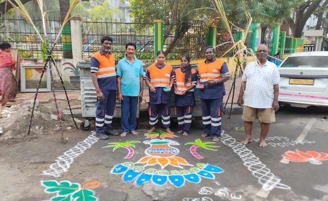 Well, the staff of Urbaser Sumeet, the waste clearance agency which works in Mylapore zone, in one area of R A Puram, continued a practice that has been carried out for Pongal.