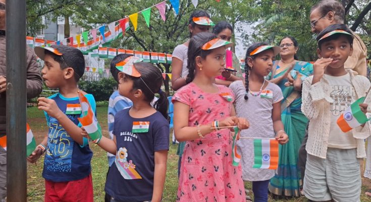 In R. K. Nagar in R A Puram, community leaders encouraged children to attend the event which was held at the local area park. Children were given sun-shades in the tricolour as well as small Indian flags, while the area around the flagpole was decorated for the occasion. ( first photo)