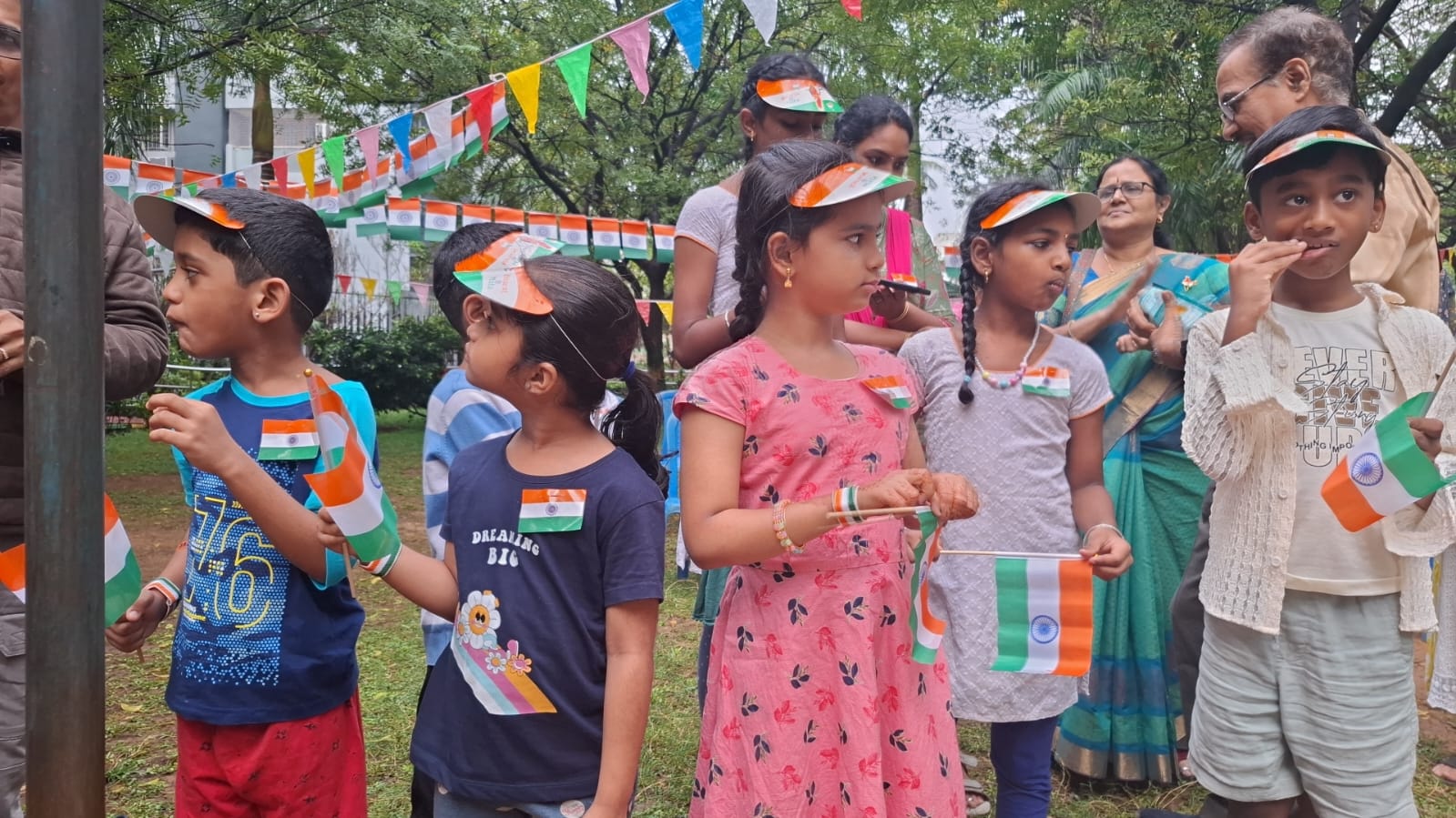 In R. K. Nagar in R A Puram, community leaders encouraged children to attend the event which was held at the local area park. Children were given sun-shades in the tricolour as well as small Indian flags, while the area around the flagpole was decorated for the occasion. ( first photo)