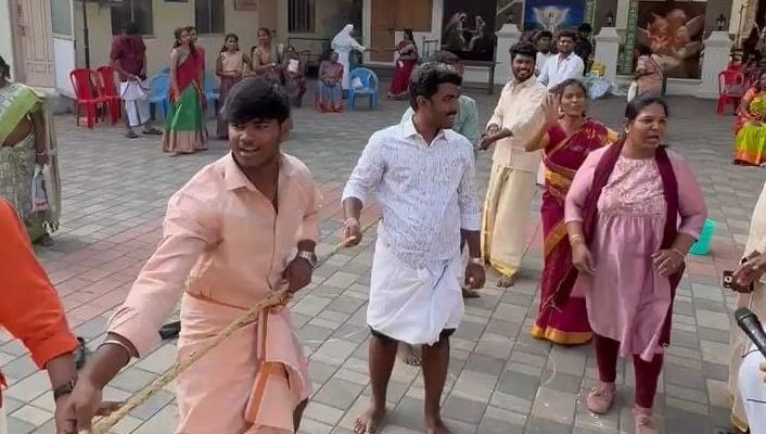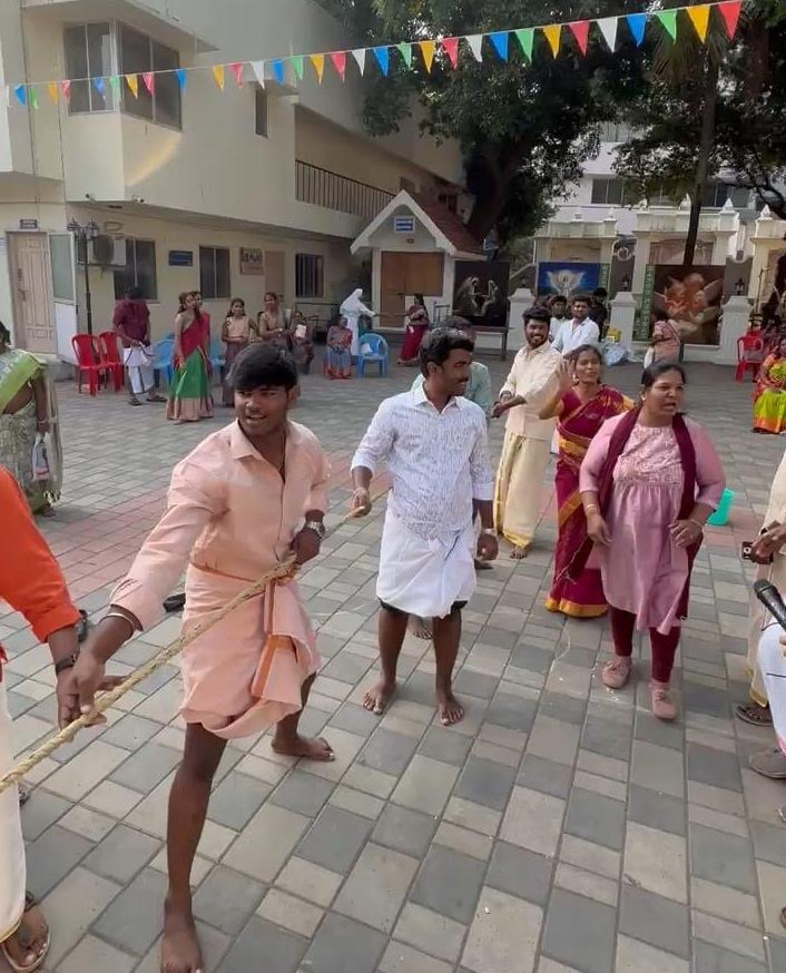 People gathered in the open yard of this campus and got involved in games like Uri Adithal, lemon and spoon race, musical chairs, needle and thread challenge and tug of war.
