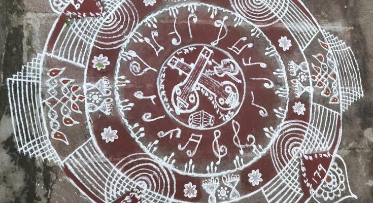 On the occasion of the 179th aradhana tribute to saint Thyagaraja, Carnatic music’s foremost composer, which is marked today, January 7, CIT Colony resident of kolam expert and scholar Gayathri Shankaranarayan designed a theme kolam this morning at the doorstep of her residence.