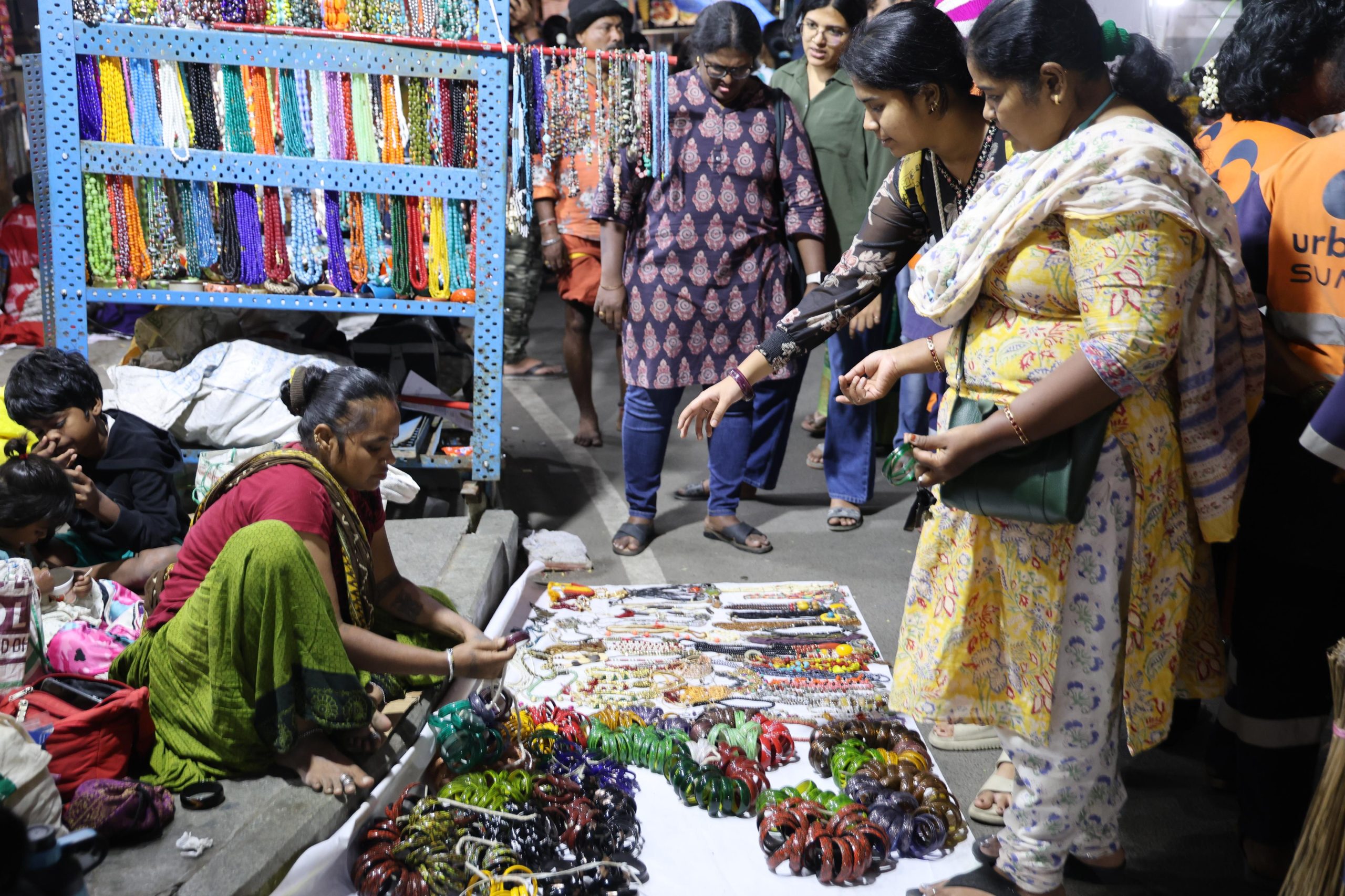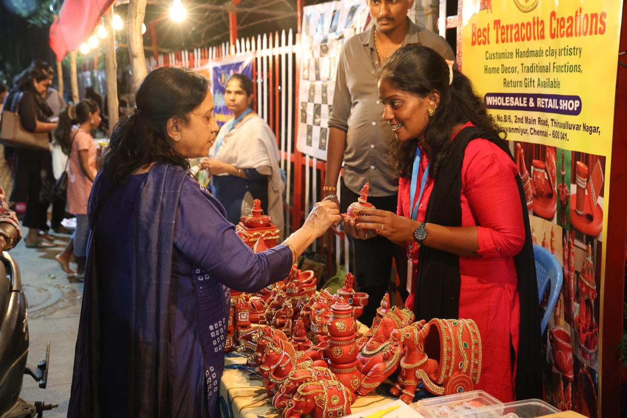 Elsewhere, on Kumaragurunathan Street, alongside the south end of the temple and on East Tank Street, 25 teams of women, all belonging to self–help groups, spread the goods they deal with, to start sales – paintings and home decor, craftwork and dry foodstuff, fashion accessories and home needs . . . for four evenings, this was a buzzing bazaar that got crowded after dusk.