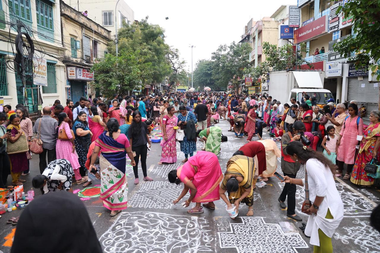 On the weekend of Jan.10 and 11, the east side of North Mada Street turned into a carpet of kolams and rangolis as over 160 people, each evening – men, women and teens – took part in the contests which are the flagship events of the festival. The grey skies, the prediction of heavy rain and the light drizzle did not dampen the enthusiasm of the participants.