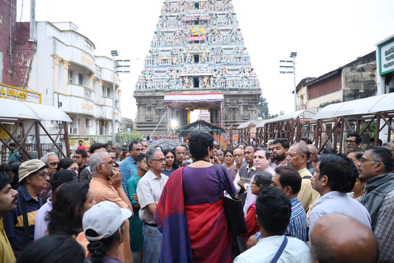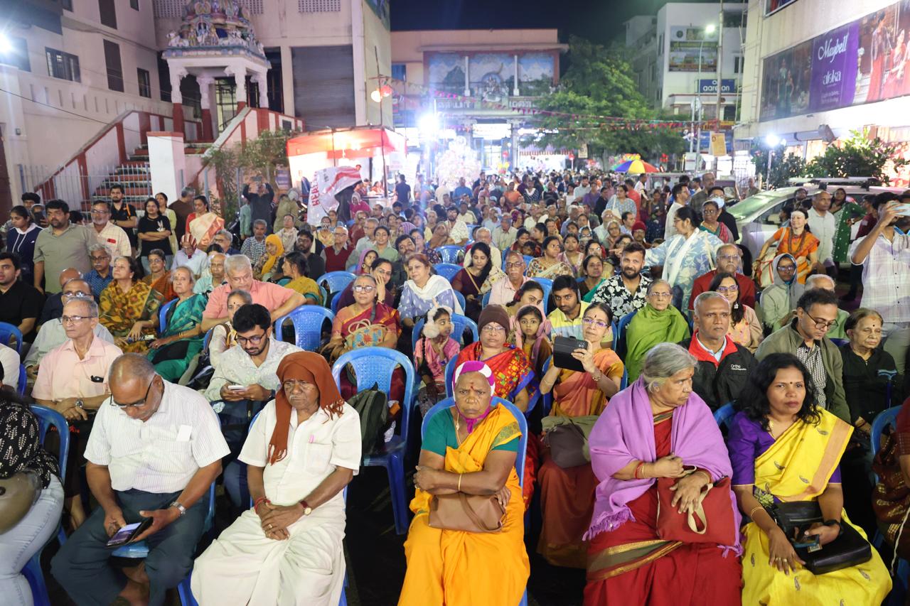 In the Sannithi Street quadrangle, where the main and secondary stages are set up for live shows on all four evenings, with the mantapam and gopuram of the temple as. a natural backdrop, a few hundred people sat down to watch what was on offer, 6 p.m. onwards – from Bharatanatyam dance-dramas and folk arts and traditional sport, from instrumental and vintage film music concerts to nagaswaram and Indian choral music. 14 shows were staged in the evenings.