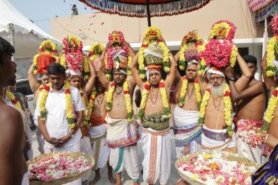 A group of priests followed the rituals prescribed for this event, carrying holy water to the top of the vimanas for Valluvar, Vasuki, Shiva, Muruga and Vinakaya, using the temporary staircases set up for this occasion.