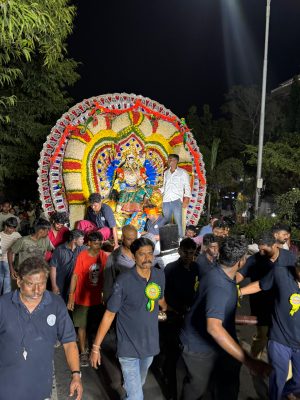 The procession, carrying the Amman in a grandly-decorated cart, began late in the evening from the lane off Greenways Road where the temple is, took the route of R. K. Mutt Road, and turned back towards Durgabai Deshmukh Road before moving to the banks of the Adyar river alongside the Muthamizh Peravai campus where the final rituals were conducted late evening.
