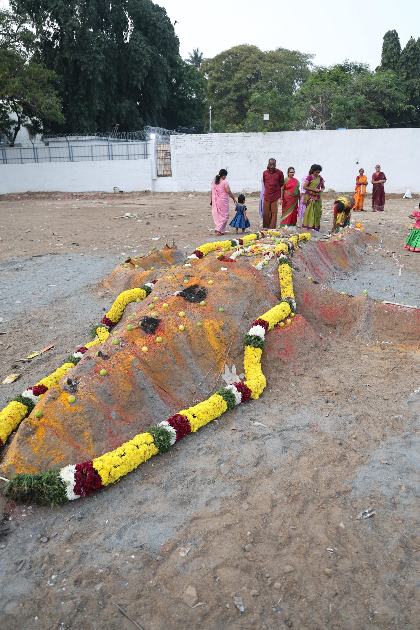 The procession, carrying the Amman in a grandly-decorated cart, began late in the evening from the lane off Greenways Road where the temple is, took the route of R. K. Mutt Road, and turned back towards Durgabai Deshmukh Road before moving to the banks of the Adyar river alongside the Muthamizh Peravai campus where the final rituals were conducted late evening.