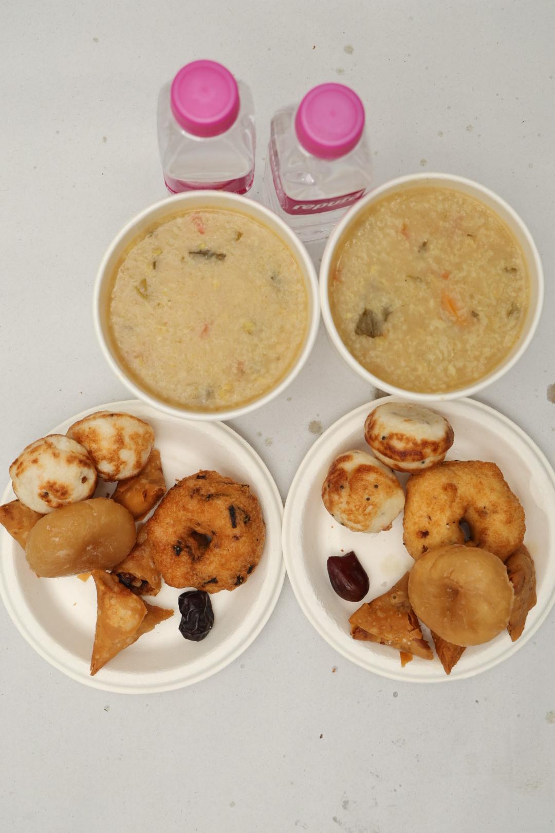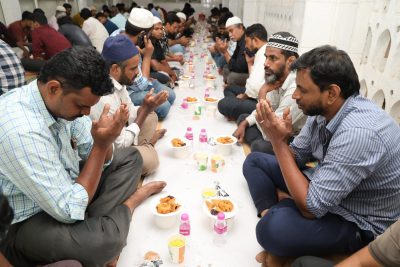 Later, around 6 p.m., after the evening prayers the congregation sits for the Iftar – besides the kanji, cutlet, samosas, small appams, a vada and water is served. This makes a full meal.