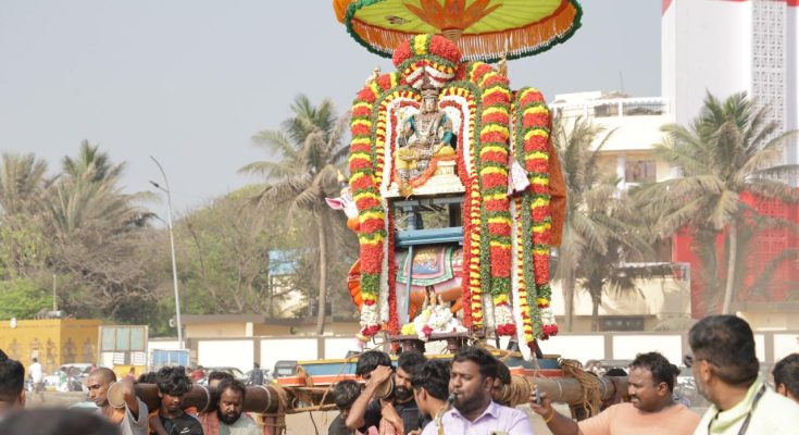 The procession carrying lord Kapali first did the rounds of Mada Streets, then went down Nadu Street, joined east end of Kutchery Road and headed to the Marina.