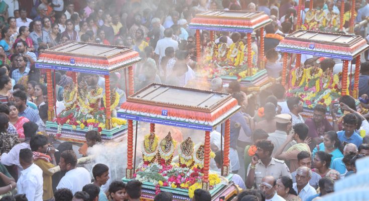Each of them slipped into the procession past 5 p.m., many placed in richly-done palaquins, fitted with LED lighting.