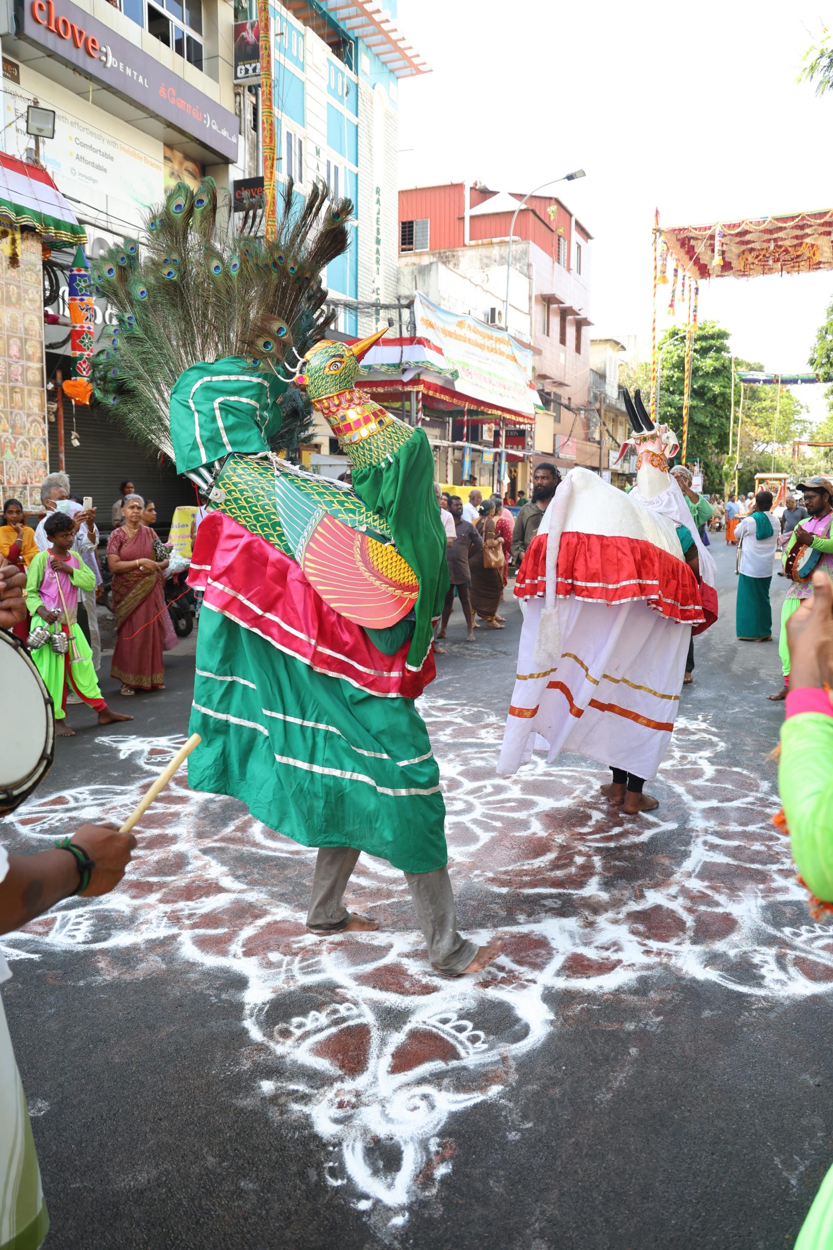 Poikkal kudhirai and mayil attam artistes danced to the tunes of musicians who led the procession, which slowly wound its way even as the 9 a.m. temperature climbded past 30 degrees.