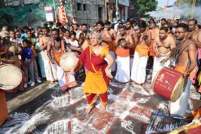 There are those who like to dance to the music of the Siva-bhaktas who are here every day with their traditional music instruments. Two children got into a dance-act on East Mada Street one morning as the artistes performed in a circle. One morning, a madisar woman danced to the music – some liked it, some were derisive in their comments.