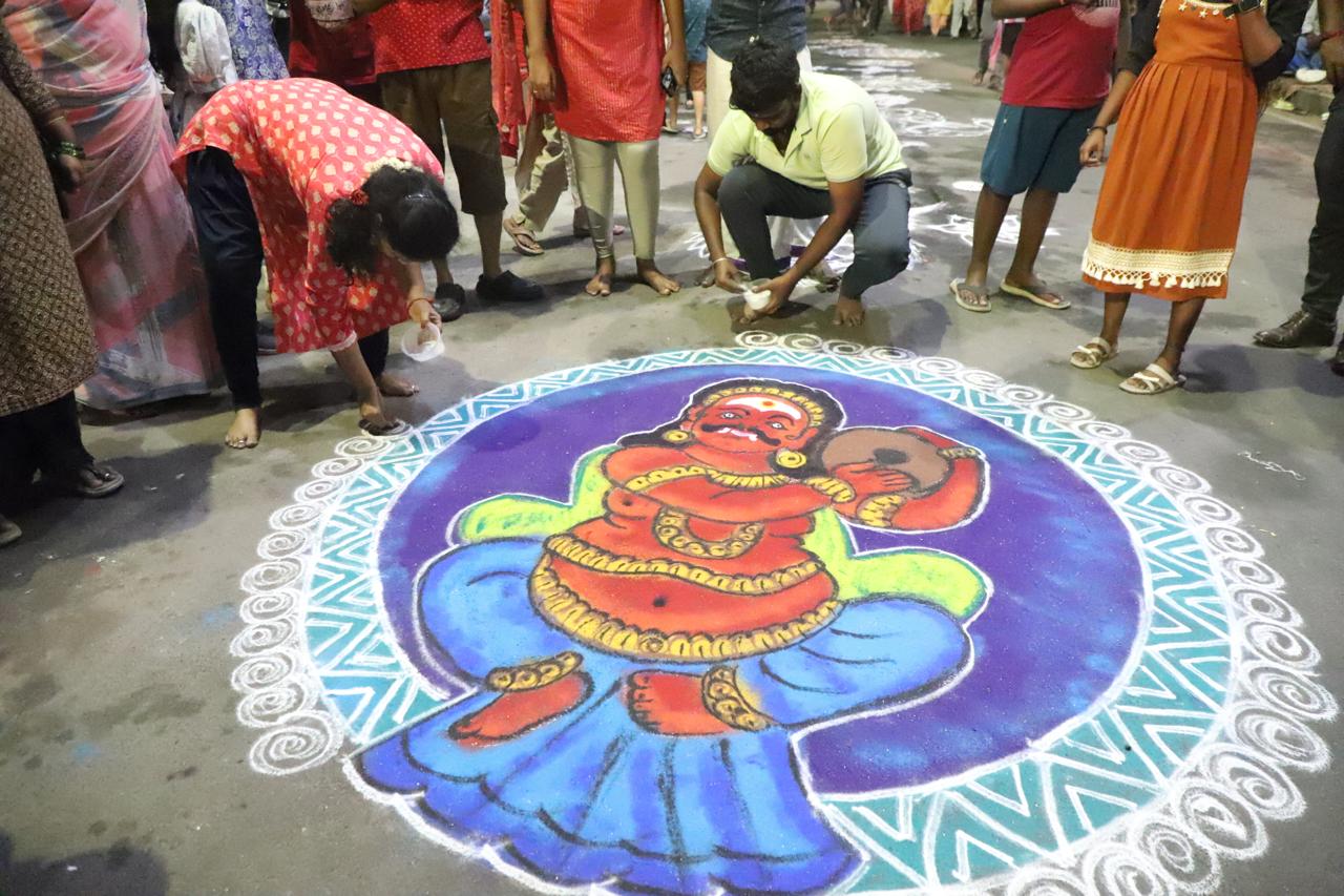 A beautiful rangoli was created of Bhoodan on the street as part of Wednesday night’s procession of the lord on the vahanam of Bhoodan, Bhoodaki and Tarakasuran. Parantharami Mani shared a photo of this.