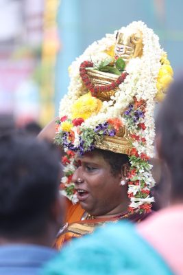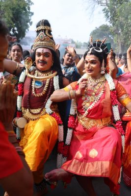 The devoted of devotees; some dancers dressed in costumes- Shiva and Parvati; some women carrying variuous forms of the lingam on their heads, and one woman who just raised her hand holding half a coconut, towards the lord in the ther.