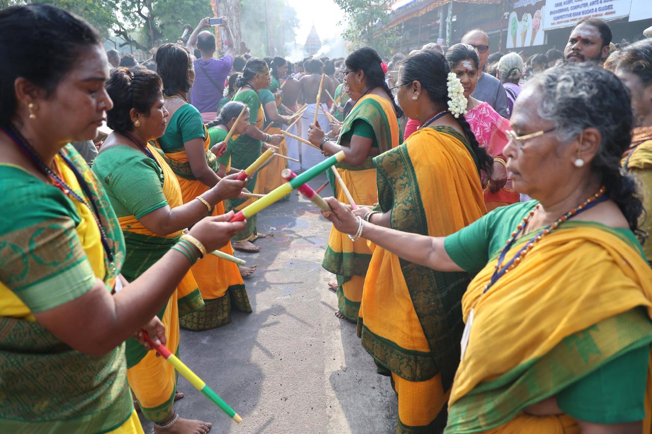 This year, the temple seems to have invited lots of artistes for the processions; folk, neo-mythological troupes joined by Sivan-adiyars with their music instruments. We spotted on this Sunday morning, women perform kol-attam. And the nagaswaram-tavil artistes have been given much space and time.