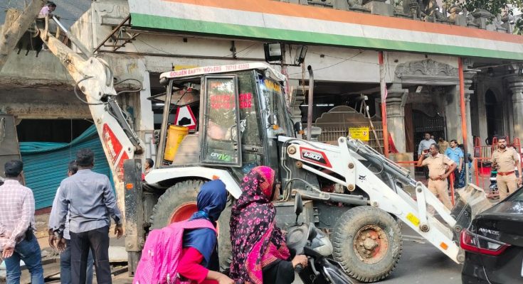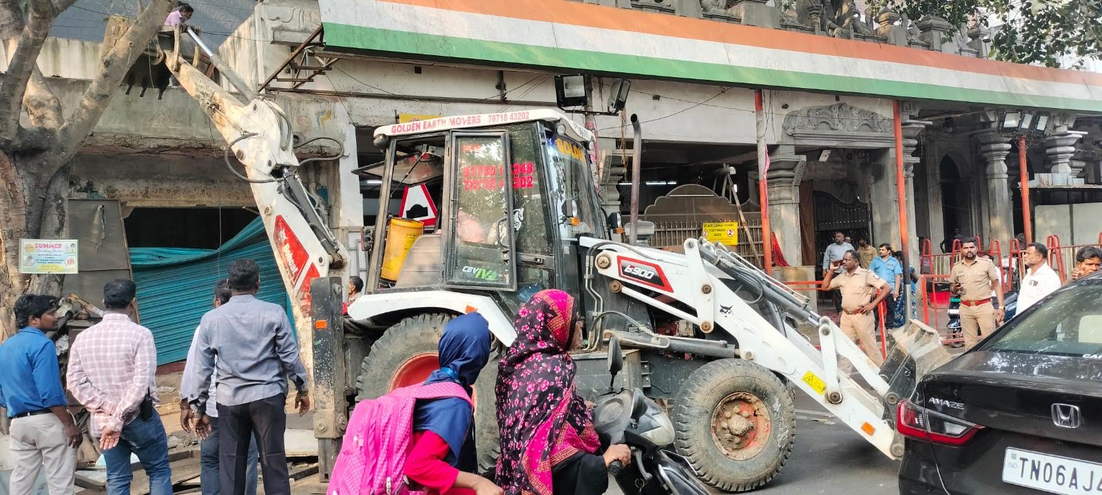 GCC officials with the assistance Mylapore Police got the demolition work going this morning. The shop-keepers, who were given advance notice, had vacated the shops and then the JCB and the workers got to work.