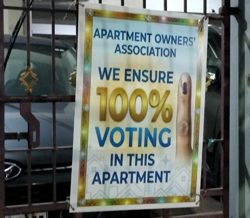Keshav Apartment in Solaiappan Street had put up a banner on its gate stating that one hundred percent voting is assured by its residents. Solaiappan Street is near Chitrakulam in Mylapore.