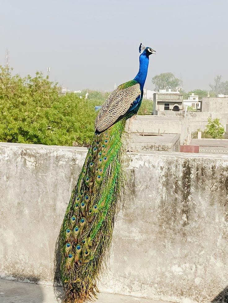 Nirmala Gopalan shared a photo of a peacock on a terrace with its long, bright plumes dropping down almost to the floor. This was seeen on North Road.