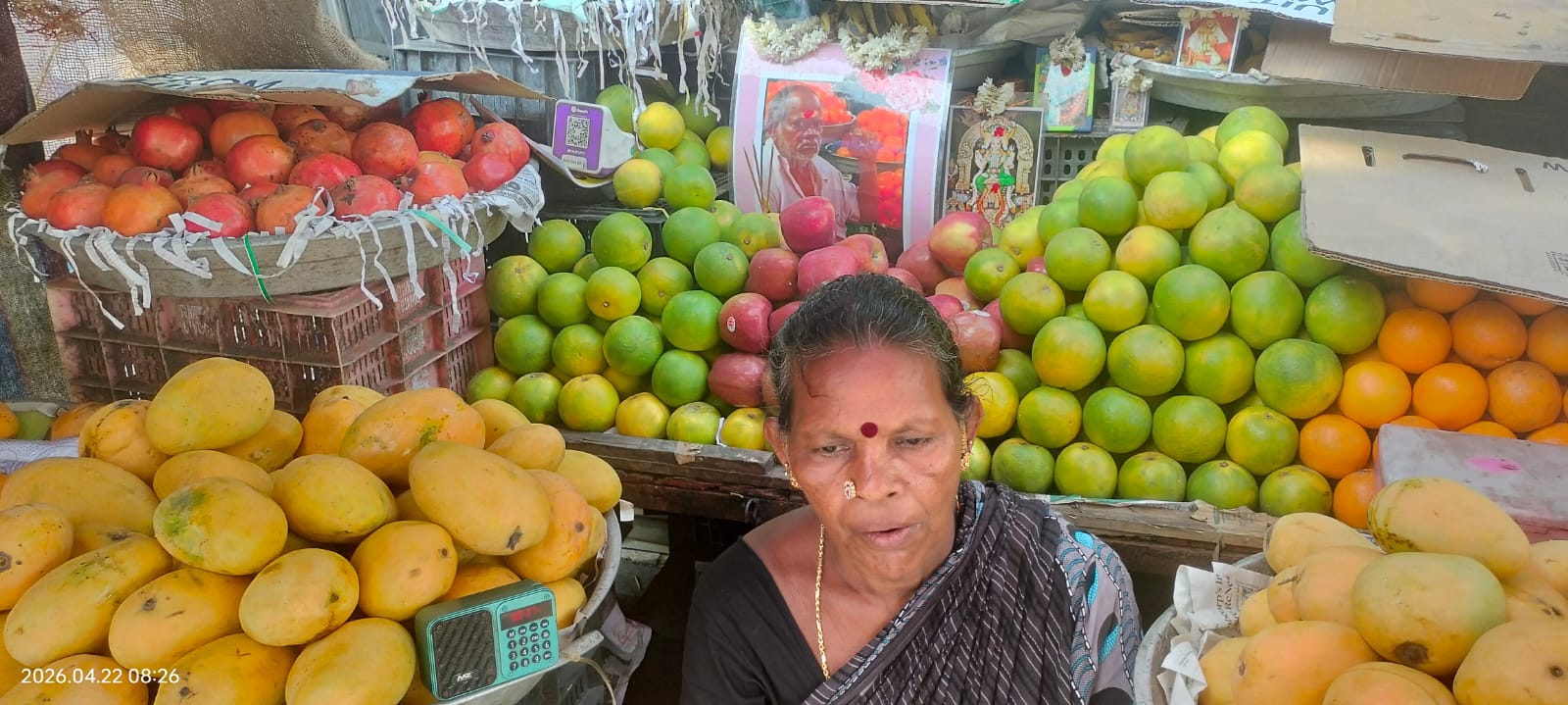 She opens her shop at 7 a.m. and it remains open past 9 p.m. A framed phot of her husband sits among the variety of fruits.