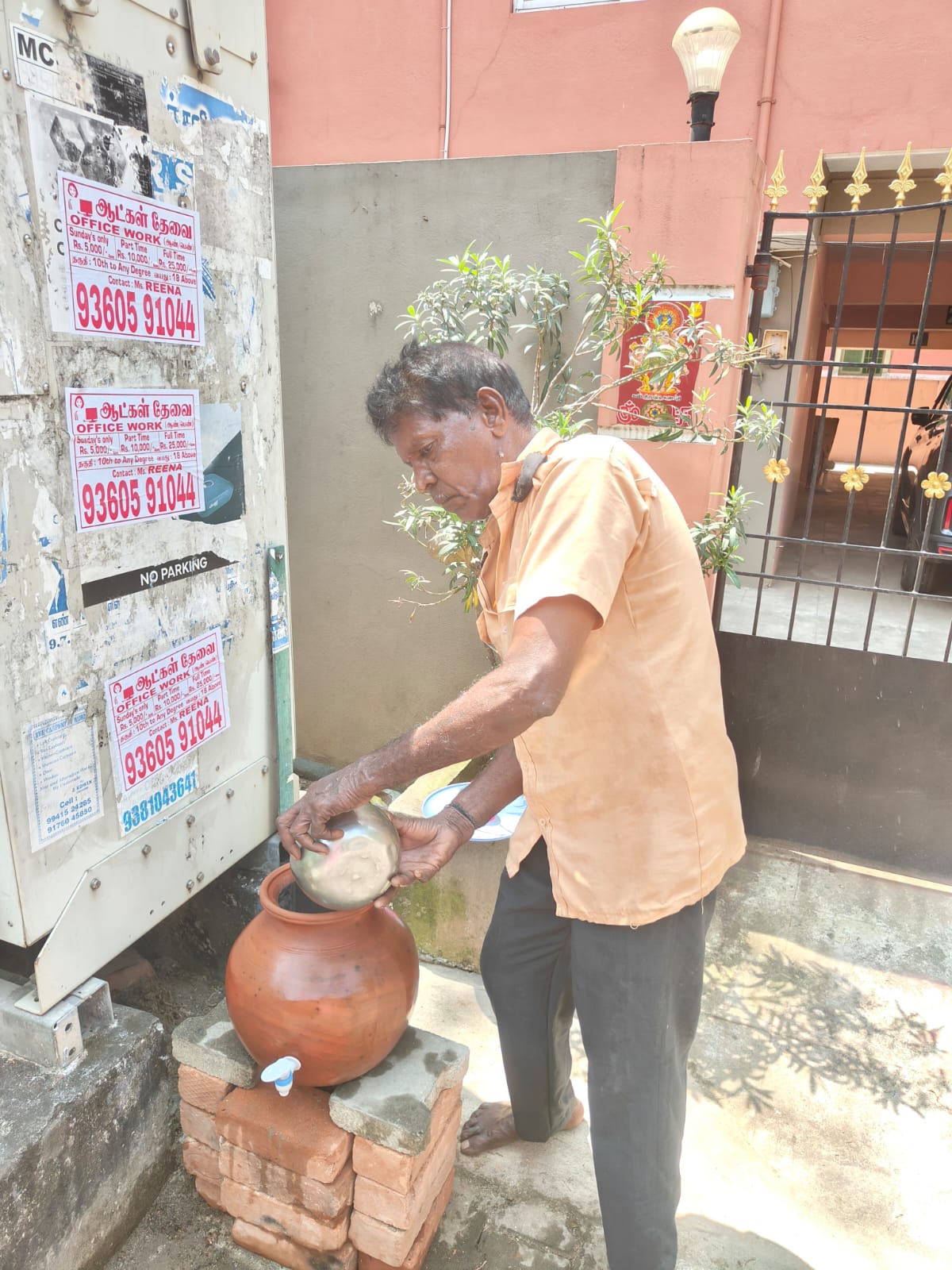 Residents in the Raja Street zone in Mandaveli are doing their bit to quench the thirst of people on the street. Some of them have kept drinking water pots at their gates.