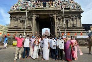 Hindu Munnani group stages protest outside temple, demands temples be re-opened